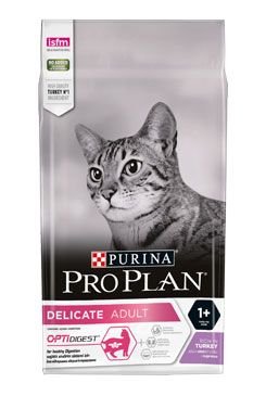 Kompletní a vysoce chutné krmivo ProPlan Cat Delicate pro kočky s citlivou kůží nebo trávením a pro velmi mlsné kočky s obsahem krůtího masa a rýže.