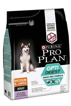 Pro Plan OptiDigest Grain Free je skvělé pro psy, kteří nemají mikroflóru zcela vyváženou. Pokud je zlobí trávení, trpí průjmy nebo zvracením, tato receptura je pro ně více než vhodná. Obsahuje jemné krůtí a kuřecí maso, místo obilovin dodává energii hrášek a maniok a přidaná prebiotika podpoří správnou funkci střevní mikroflóry.