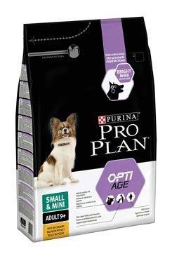 PRO PLAN® Small & Mini Adult 9+ s OPTIAGE® je kompletní krmivo pro psy malých a mini plemen starší 9 let. Krmivo s OPTIAGE®, vytvořené na základě nejnovějších vědeckých poznatků z oblasti výživy psů našimi veterináři a specialisty na výživu, obsahuje patentovanou* směs živin, včetně triglyceridů se středním řetězcem (MCTs 5.5%), která napomáhá psům starším 9 let zůstat aktivní a čilí po delší dobu. Také pomáhá zvyšovat zájem starších psů o hraní, takže si s nimi můžete užívat aktivní život co nejdéle.