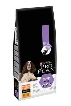 PRO PLAN Medium & Large Adult 7+ s OPTIAGE pro psy středních a velkých plemen starší 7 let. Granulované krmivo s obsahem kuřecího masa. Receptura je doplněna rybím olejem, který má výborný vliv na zrak, činnost srdce i mozku. Složení je sestaveno pro přirozené a pohodové stárnutí vašeho psa. Výživa kloubů a péče o zuby.