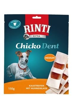 RINTI Chicko Dent se připravují výlučně z telecí kůže pevné na skus s vložkou z čerstvých filetů z kuřecích prsou, obohacené speciálním komplexem účinných látek pro denní ošetřování zubů.