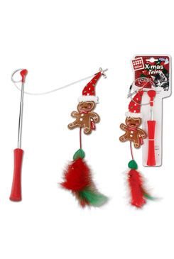 Teleskopická, nerezová udice s textilní hračkou - vánočním perníčem, ozdobneným peřím a kovovou rolničkou. Ideální hračka k vánočnímu stromečku.