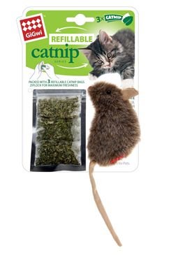 Plyšová myš s kapsou a třemi vyměnitelnými sáčky plněnými šantou kočičí.