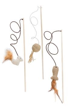 Udička ze dřeva s hračkou je ideální hračkou pro kočky, které rády tráví svůj čas hrou. Rybářský prut podporuje zájem kočky a zvyšuje její zvídavost. Tato hračka pro kočky je vyrobena ze dřeva a má vtipný přívěsek, který je vyroben ze šňůry a syntetických vláken. Pokud s udičkou budete mávat, přívěsek se houpe a kočka jej loví (podporuje lovecký instinkt).
