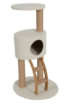 Montana 3 kočičí strom je kombinací odpočívadel s prostorným domečkem a škrabadel z přírodního konopí. Domeček je přístupný prostřednictvím originálního dřevěného žebříku, který má zaoblený tvar a stupátka pokrytá konopím ke škrábání.
