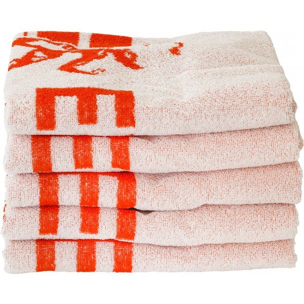 Funkční stylový froté ručník s oboustranným potiskem - jedna strana bílá s logem v oranžovém provedení, druhá oranžová se zrcadlově umístěným bílým logem.