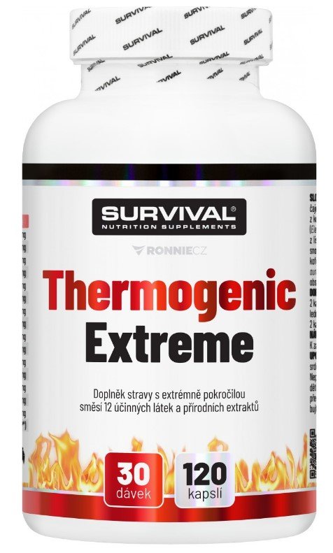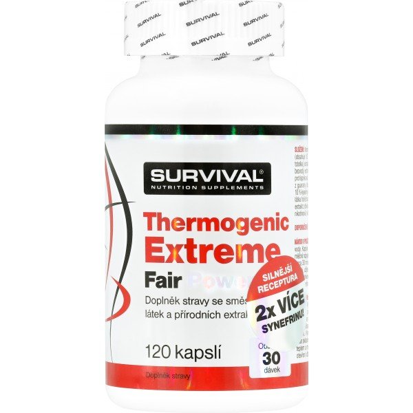 Thermogenic Extreme je v současnosti nejsilnějším komplexním doplňkem sportovní výživy pro všechny sportovce usilující o podporu spalování podkožních tuků. Obsahuje unikátní kombinaci 12 účinných a vědeckými výzkumy ověřených látek (kompletní popis včetně odkazů na studie najdete níže). Tato novinka společnosti Survival je silnější a ještě účinnější verzí oblíbeného Thermogenic Fair Power, kterého se jen v České republice prodalo přes 30.000 kusů. Porovnáte-li složení Thermogenic Extreme Fair Power s jakýmkoliv (!) doplňkem stravy pro podporu spalování tuků, sami si ověříte, že nový „Extreme“ je tím nejsilnějším suplementem, jaký současný trh se sportovní výživou nabízí.