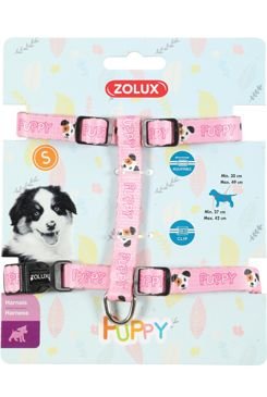 Nastavitelný textilní postroj pro štěňata v jemných pastelových barvách s nápisem PUPPY a obrázkem.