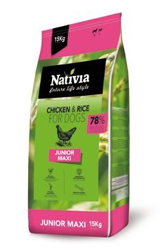 Receptura respektuje přirozené zákonitosti výživy psa. Obvyklá kombinace obilovin či brambor je zcela nahrazena pouze kvalitní rýží. Ta svojí stravitelností a profilem aminokyselin tyto tradiční suroviny převyšuje, nezatěžuje organismus a společně s ostatními komponentami výrobku zajistí zdravou výživu psa. Nativia Junior maxi v řadě Chicken&Rice obsahuje 78% bílkovin živočišného původu.