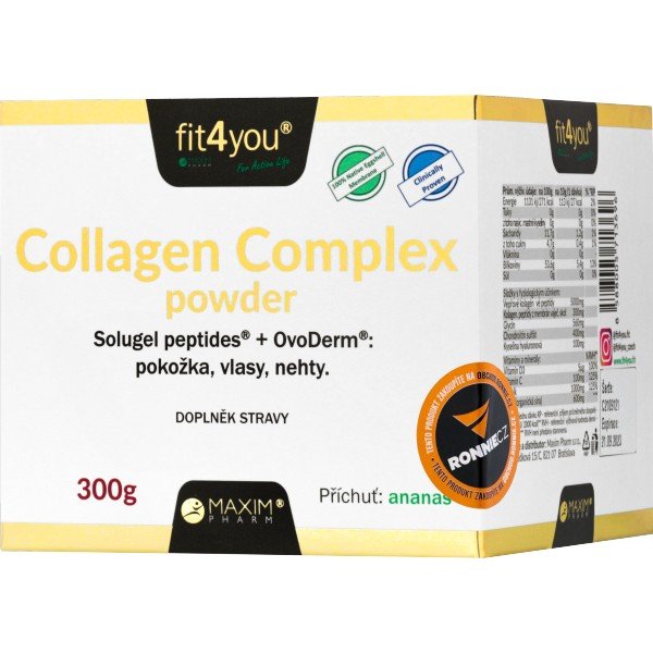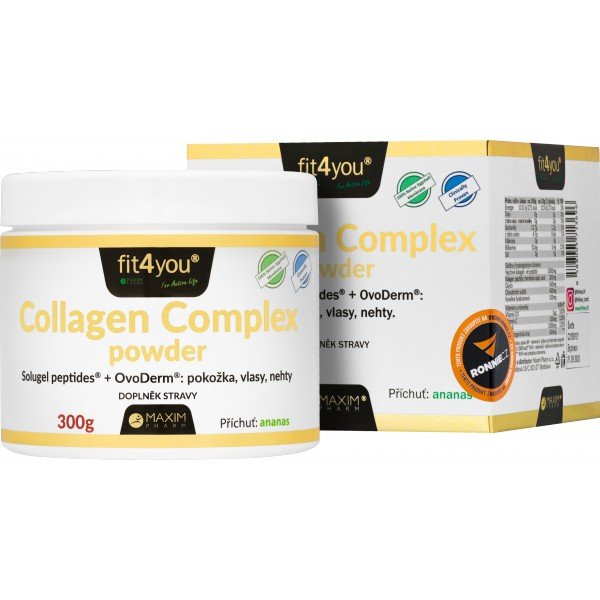 Collagen Complex je sypký výživový doplněk, vícesložkový účinný prášek s příchutí na podporu zdravé pokožky, vlasů, nehtů, kloubů, vazů a šlach. Komplex obsahuje vitamín C, který přispívá ke správné funkci pokožky, ke správné tvorbě kolagenu a funkci kostí a chrupavek. Přípravek obsahuje vysoce kvalitní vepřové kolagenní peptidy a unikátní kolagenní peptidy z membrán vaječných skořápek – klinicky testovaný Ovoderm®. Původ hydrolyzovaného vepřového kolagenu: Německo.