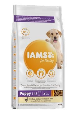 Krmivo IAMS for Vitality pro štěňata velkých plemen je 100% kompletní a vyvážené odborníky sestavené krmivo, které bude vašemu štěněti svědčit. Naše nová a vylepšená receptura pro štěňata s čerstvým kuřecím masem je založena na kvalitních živočišných bílkovinách, které byly pečlivě vybrány, aby podporovaly sedm znaků zdravé vitality štěněte. Aby byla štěňata zdravá, aktivní a plná energie, obsahují naše lahodné receptury až 81 % živočišných bílkovin z kuřecího masa (z celkového obsahu bílkovin).