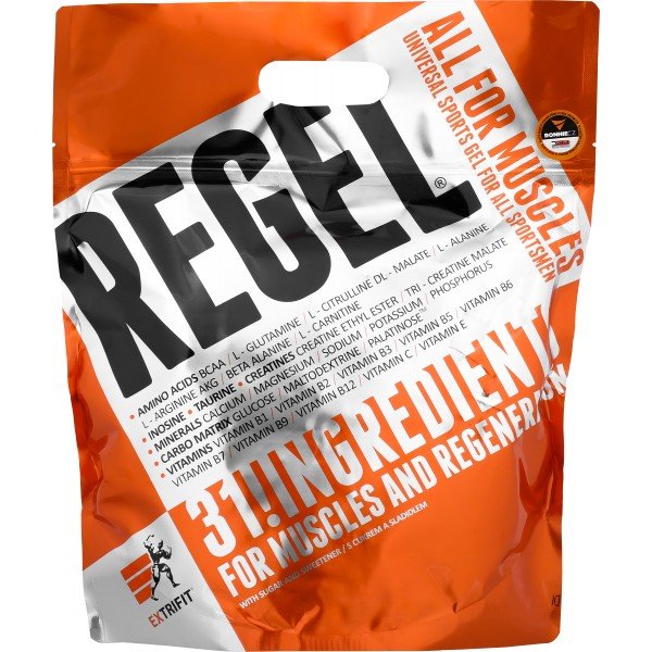 Lámali jste si někdy hlavu nad tím, jaké všechny látky a v jakém množství máte dávkovat pro urychlení regenerace po tréninku? Jaké přijímat sacharidy, jak dávkovat aminokyseliny nebo kolik užívat glutaminu a kreatinu pro odvrácení katabolismu po tréninku? Firma Extrifit vyslyšela tyto Vaše časté dotazy! Regel je dokonale sestaveným komplexem všech látek, které sportovec nutně potřebuje doplnit v průběhu a po skončení tréninku! Regel obsahuje pečlivě vyvážený poměr tří druhů sacharidů a volných aminokyselin, anabolizéry, dvě formy kreatinu a komplex vitamínů a minerálních látek. A to vše ve formě hotového gelu připraveného k okamžité konzumaci.