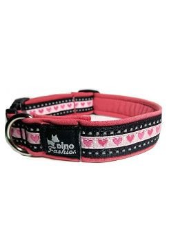 Základ tvoří pevný popruh s reflexními prvky, který je pošitý růžovým softshellem se stuhou s motivem srdíček. Velikost obojku je nastavitelná se zapínáním na plastový trojzubec.