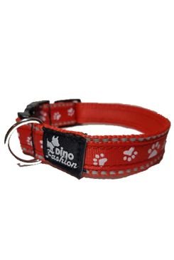 Reflexní obojek Dinofashion vyrobený z popruhu se stuhou s motivem barevných tlapek. Na vnější straně je našitá reflexní páska, která ve tmě pod ozářením silně odráží světlo. Obojek je proto důležitým bezpečnostním prvkem při večerním a nočním venčení psa.