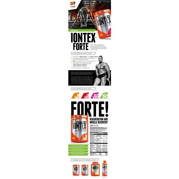 Iontex Forte je špičkově sestavený iontový a regenerační koncentrát pro přípravu 10 až 18 litrů nápoje pro doplnění minerálních látek, vitamínů a energie během sportovního výkonu a také po výkonu. Vzhledem k vyššímu obsahu energie a minerálů je Iontex Forte ve vyšší dávce (40 g) vhodný pro dlouhodobé vytrvalostní výkony trvající více hodin. Nicméně jeho použití v nižší dávce 20 g je vhodné i pro krátkodobé vytrvalostní výkony (do 1 hodiny) či silové výkony. Přídavek taurinu může pomoci zachovat správnou koncentraci a stimuluje k vyšším výkonům.