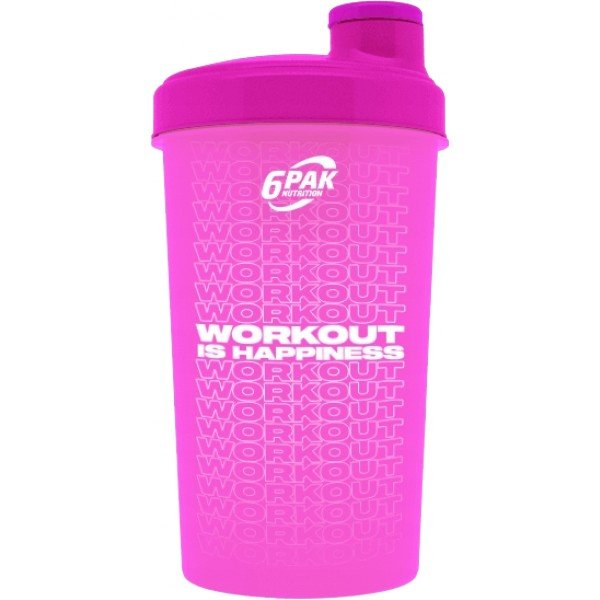 Šejkr firmy 6Pak je transparentní, růžové barvy s růžovým uzávěrem i malým šroubovacím víčkem. Na šejkru je logo 6Pak Nutrition v bílém provedení, na druhé straně nápis Workout Is Hapiness. Po stranách jsou průhledy s ryskami v ml/oz pro odměření. Objem šejkru je 700 ml. Šejkr obsahuje mřížku pro lepší rozmíchání nápoje.