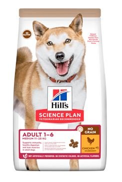 Receptura krmiva Hill’s Science Plan No Grain Medium Adult s kuřetem je speciálně sestavena tak, aby u psů v nejlepších letech života podpořila jejich energetické potřeby. Vyrobeno z vysoce kvalitních, snadno stravitelných surovin.