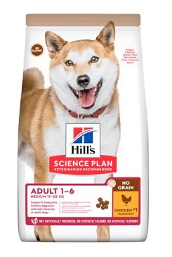 Receptura krmiva Hill’s Science Plan No Grain Medium Adult s kuřetem je speciálně sestavena tak, aby u psů v nejlepších letech života podpořila jejich energetické potřeby. Vyrobeno z vysoce kvalitních, snadno stravitelných surovin.