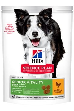HILL'S SCIENCE PLAN Senior Vitality krmivo pro starší psy s kuřetem a rýží poskytuje přesně vyváženou výživu, která podporuje každodenní energii a vitalitu. Speciální směs ingrediencí podporuje funkci mozku, interakci, energii a vitalitu Omega-3 a -6 mastné kyseliny pro krásnou srst Lehce stravitelné ingredience pro zdravé zažívání