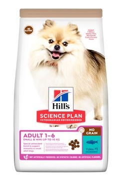 Velká láska, malá velikost. Hill’s Science Plan No Grain Small & Mini Adult krmivo pro psy s tuňákem je výživa na míru jedinečným potřebám psů malých a trpasličích plemen v nejlepších letech jejich života. Speciální krmivo ve formě těch nejmenších granulí.