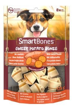SmartBones® Sweet Potato Bones jsou neodolatelné chutné žvýkací kosti s lahodnými batáty. Jejich žvýkání je zábavné, protože svačina neobsahuje jen zeleninu, ale také neodolatelné batáty. Žvýkací kosti jsou obohaceny o vitamíny a minerály, mají extra nízký obsah tuku a jsou snadno stravitelné. Žvýkání kostí má přirozený abrazivní a čistící účinek, který podporuje dentální hygienu vašeho psa a udržuje jeho zuby zdravé. Vhodné pro malá plemena psů.