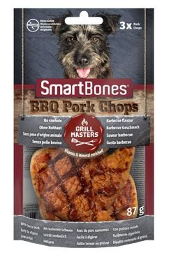 SmartBones® BBQ Pork Chops jsou neodolatelné lahodné žvýkací pochoutky bez surové kůže s grilovanou příchutí a chutným vepřovým masem. V kombinaci s jedinečným tvarem kotlety vypadají a voní BBQ Pork Chops jako skutečné grilované maso, kterému váš pes neodolá.