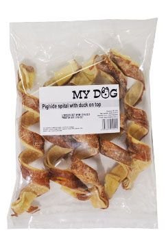 Spirála z vepřové kůže obalená kachním masem. Vynikající pamlsek pro psy. Složení: vepřová kůže 78%, kachní maso 22%