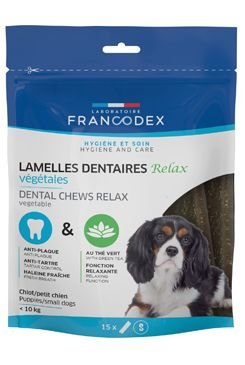 Dentální plátky RELAX pro malé a střední psy pomáhají snižovat tvorbu zubního plaku a kamene a osvěžuje dech vašeho psa díky jejich abrazivnímu povrchu a tvaru do písmene „Z“. Žvýkací plátky obsahují zelený čaj - zdroj L-theaninu, o kterém je známo, že má uklidňující účinky. Bez přidaných barviv.