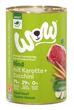 WOW Hovězí s karotkou je kompletní mokré krmivo pro dospělé psy všech plemen se 71% obsahem masa a vnitřností od předního rakouského výrobce. Maso je doplněno zeleninou, bylinkami z Alp a vysoce kvalitním lněným olejem. Konzervy jsou ručně plněné v rodinné rakouské firmě z místních, většinou alpských, surovin ze zdravé přírody.