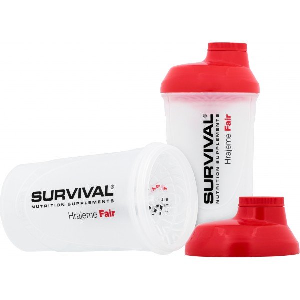 Šejkr Survival je transparentní barvy s červeným uzávěrem i malým šroubovacím víčkem. Na šejkru je nápis Survival Hrajeme Fair v černo-červeném provedení. Po stranách jsou rysky v ml/oz pro odměření. Objem šejkru je 600 ml. Šejkr obsahuje mřížku pro lepší rozmíchání nápoje.