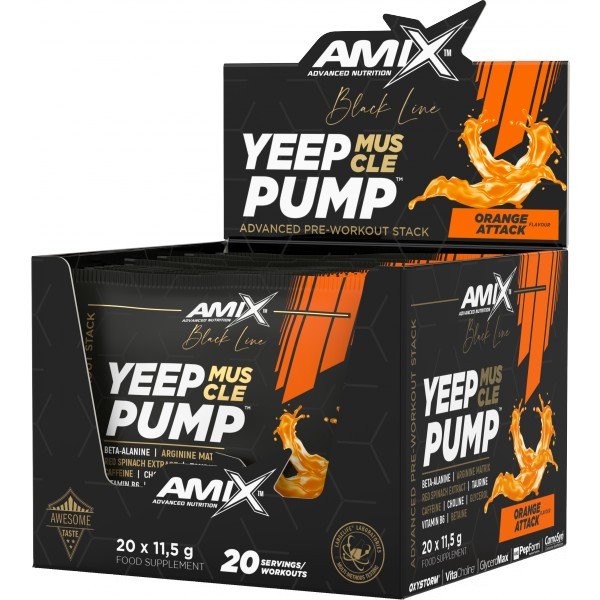 Yeep Pump z řady Black Line je revoluční superkoncentrovaný předtréninkový doplněk určený pro nejnáročnější sportovce, aby posunuli své intenzivní tréninky na další úroveň. Tento osvěžující a chutný nápoj je založen na dávce 3 g CarnoSyn® beta-alaninu a obohacen o argininový komplex, taurin, L-lysin, glycerin GlyceroMax™, VitaCholine®, extrakt z červeného špenátu Oxystorm®, betain, kofein a vitamín B6. Vitamín B6 pomáhá snižovat únavu a vyčerpání, zatímco kofein přispívá ke zvýšení odolnosti, pomáhá zlepšit koncentraci a bdělost.