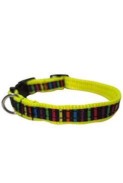 Popruhový obojek Dinofashion pro malá plemena.Základ obojku tvoří pevný popruh ve žluté barvě, na kterém je našita stuha s motivem Coloured Stripe. Obojek se zapíná na plastový trojzubec. Plastová posuvná spona umožňuje jednoduché a přesné nastavení délky. Na obojku je připevněno kovové oko, které slouží k připnutí vodítka.