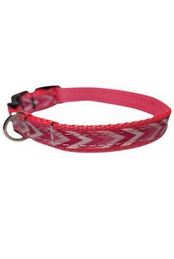 Popruhový obojek Dinofashion pro malá plemena. Základ obojku tvoří pevný popruh v růžové barvě, na kterém je našita stuha s pestrým motivem. Obojek se zapíná na plastový trojzubec. Plastová posuvná spona umožňuje jednoduché a přesné nastavení délky. Na obojku je připevněno kovové oko, které slouží k připnutí vodítka.
