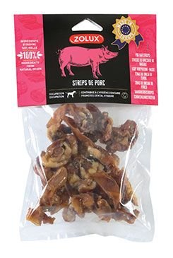 Pochoutka pro psy v podobě proužků z vepřových uší skvěle doplní každodenní porci krmiva. Svačiny připravené ze 100% ingrediencí přírodního původu jsou mimořádně chutné a díky své specifické, tvrdé textuře pozitivně působí na ústní hygienu a pomáhají udržet svěží dech. Díky vhodné tepelné úpravě výrobek nevyžaduje použití konzervačních látek.