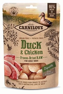 Lyofilizované pamlsky pro psy Carnilove FD slouží jako pamlsek nebo jako topper na suché nebo mokré krmivo a neměly by nahrazovat kompletní a vyváženou stravu. Podávejte snacky pouze jako součást zdravého jídelníčku psa. Berte na vědomí, že nutriční hodnota 100 g lyofilizovaného výrobku odpovídá +/- 300 g čerstvého syrového masa.