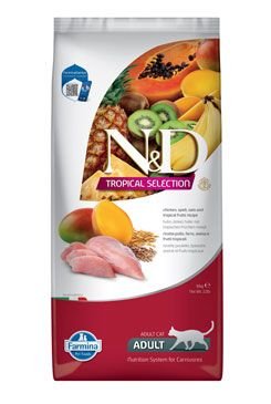 Kuře, špalda, oves a tropické ovoce. Kompletní krmivo pro dospělé kočky.