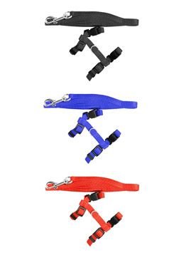 Vodítko/postroj pro malá zvířata, kde ramínka jsou nastavitelná pomocí plastových spon, popruh vodítka na jedné straně s kovovou karabinou a na straně druhé zakončen rukojetí, což umožňuje pohodlné vedení zvířete.