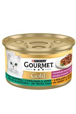 Kompletní, superprémiové krmivo Gourmet Gold konz. pro dospělé kočky všech plemen, s obsahem dušeného králičího masa a játry.