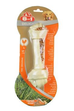 Žvýkací kosti Delight 8in1 jsou velmi lahodné. Díky kombinaci surové kůže a chutného masa uprostřed uspokojí přirozený instinkt psa žvýkat a zároveň procvičují čelistní svalstvo. Pamlsky pro psy podávejte jako odměnu, motivaci nebo jako zpěstření běžné stravy. Žvýkací kost je obohacena o minerály a uvnitř je sušené kuřecí maso.