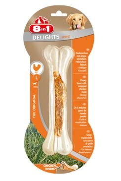 Extra pevné žvýkací kostičky 8in1 Delights Strong dlouho vydrží. Kuřecí maso je zabalené do velmi tvrdé prémiové surové kůže, která podporuje dentální péči. Pamlsky pro psy Delights S jsou vhodné pro menší a střední psy. Pravidelné žvýkání eliminuje tvorbu zubního plaku a kamene.