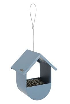 Venkovní kovové krmítko na semínka. Krmítko má stříšku a pevné kovové poutko na zavěšení.