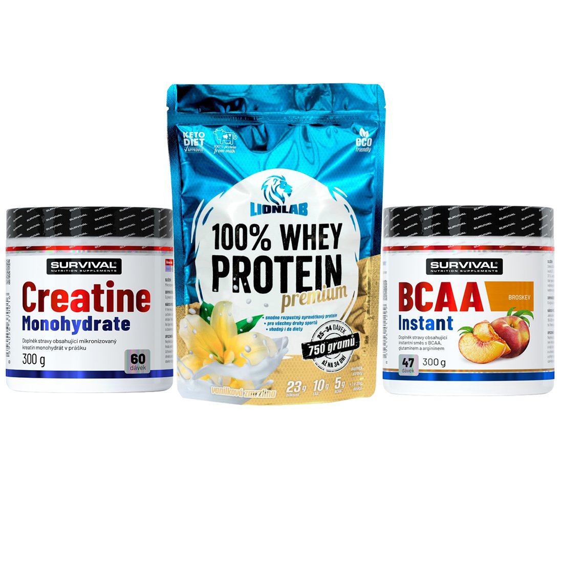- Propojená síla produktů – Kreatin ti dodá sílu, BCAA ochrání a regeneruje tvé svaly, a protein zase poskytne stavební materiál pro jejich růst. Společně fungují jako dokonalý tým.