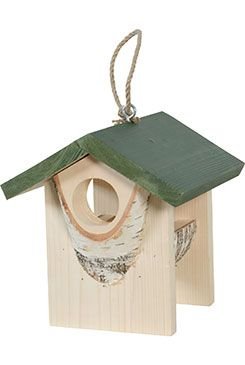 Budka (krmítko pro ptáky) se střechou z masivního dřeva o tloušťce 17 mm pro volně žijící ptactvo. Přírodní vzhled dřeva, který splyne se zahradou, dodáváno se silným provazem k zavěšení.