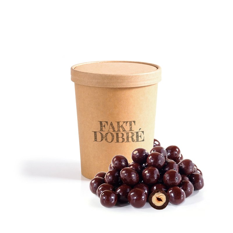 Pražené lískové ořechy s kvalitní hořkou čokoládou, ideální jako luxusní svačinka.