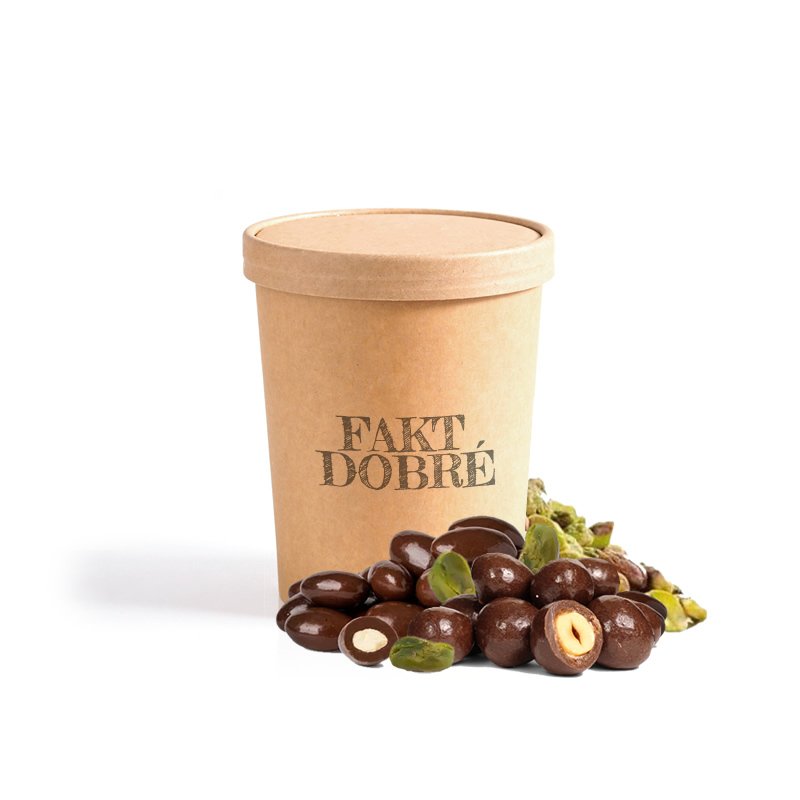 Směs loupaných pistácií, mandlí v hořké čokoládě, lískových oříšků v mléčné a hořké čokoládě.