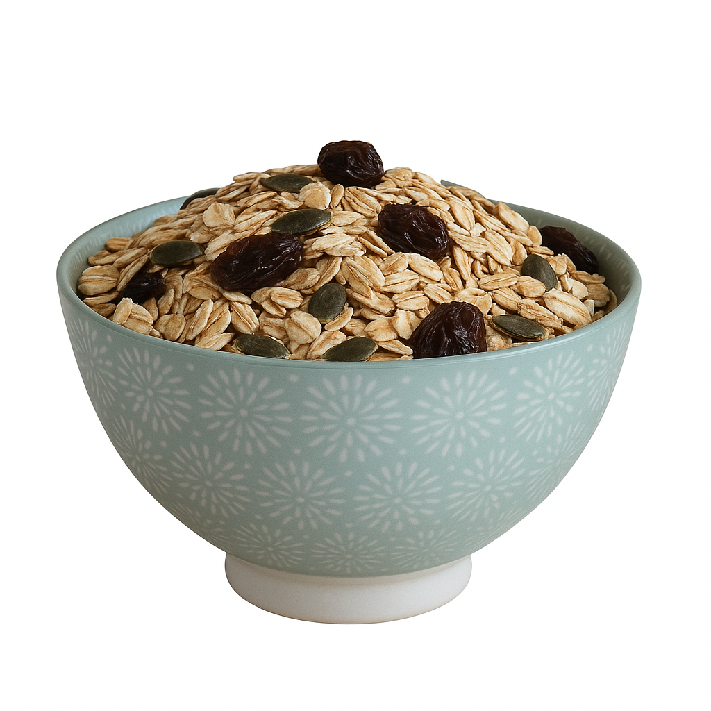 Müsli s rozinkami je vyvážená směs z 65 % ovesných vloček, doplněná o dýňová a slunečnicová semínka a nesířené rozinky. Bohatá na vlákninu, zdravé tuky a přírodní cukry.
