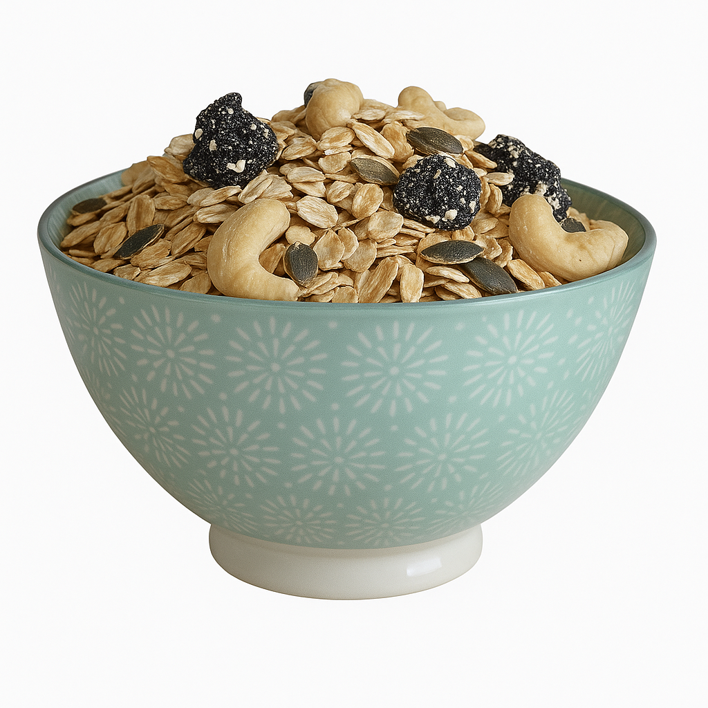 Kombinace vloček, kešu a semínek zajišťuje postupné uvolňování energie bez výkyvů cukru v krvi.