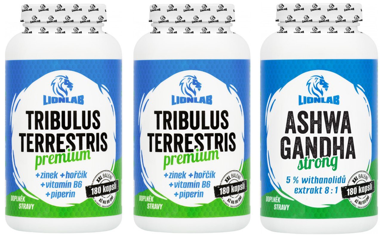 Extrémně výhodný akční balíček obsahující 2 velké 180kapslové balení silného Tribulu Terrestris a k tomu další 180kapslové balení Ashwagandha Strong XXL.