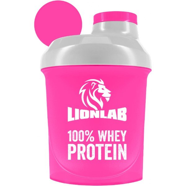 Šejkr Lionlab a Ronnie.cz má růžovou barvu s bílým uzávěrem a růžovým malým šroubovacím víčkem. Na šejkru je na jedné straně logo Lionlab a nápis 100% Whey Protein, na druhé straně je logo Ronnie.cz, oboje v bílém provedení. Po straně jsou rysky v ml pro odměření. Objem šejkru je 300 ml. Šejkr obsahuje mřížku pro lepší rozmíchání nápoje.