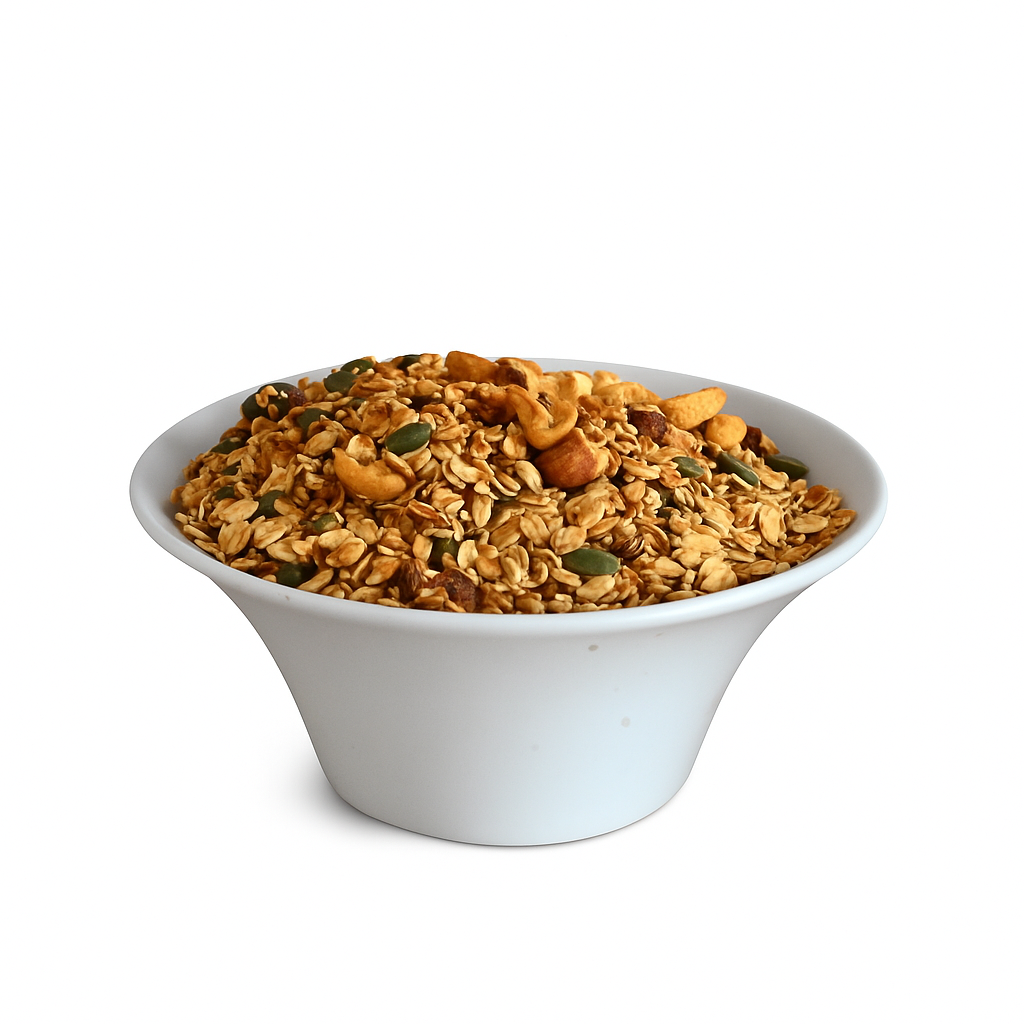 Granola je slaná a křupavá, ideální jako topping do krémových polévek nebo jako zahušťovadlo do pomazánek.